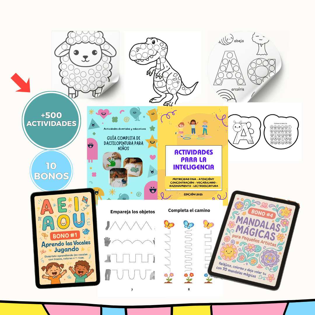 ✅ 10 BONOS EDUCATIVOS llenos de juegos, afirmaciones, mandalas, actividades de conteo, colores, dactilopintura y mucho más.