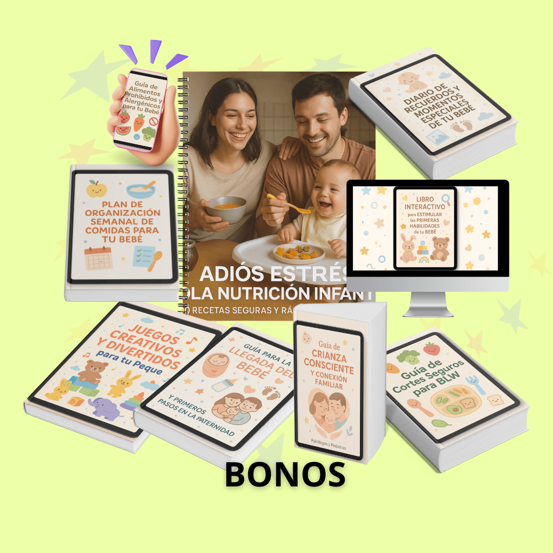 ✅ 8 Bonos educativos con un paquete completo de guías, juegos, diarios y herramientas creadas por especialistas para acompañarte en el sueño, la alimentación, la organización y la crianza de tu bebé.