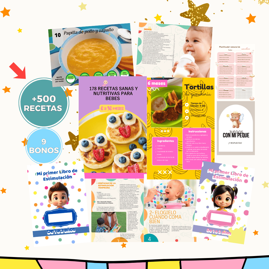 Es una guía digital súper completa, dividida por edades y etapas, con más de 500 recetas fáciles, nutritivas y aprobadas para bebés, desde los 6 meses hasta los 5 años.